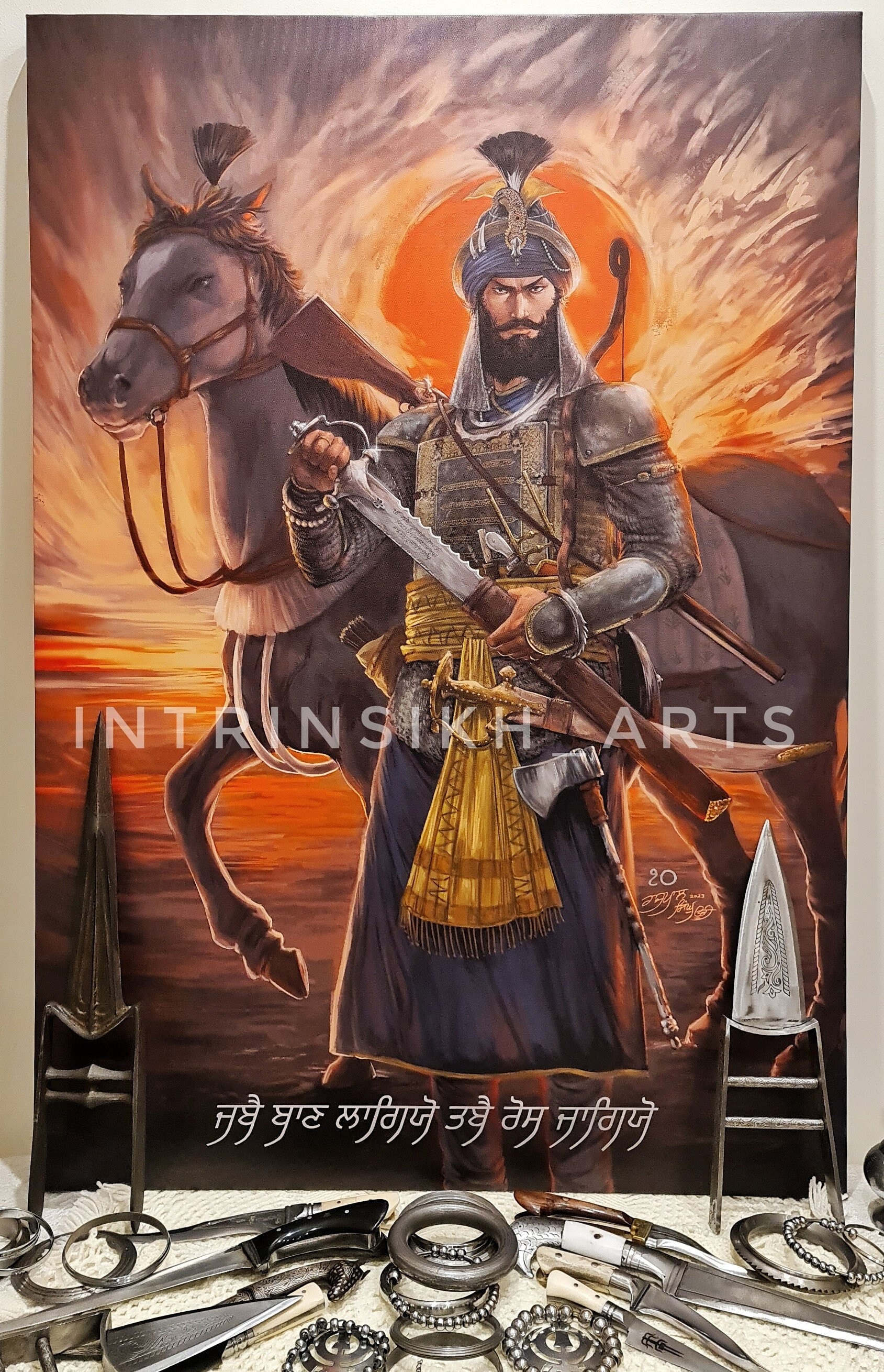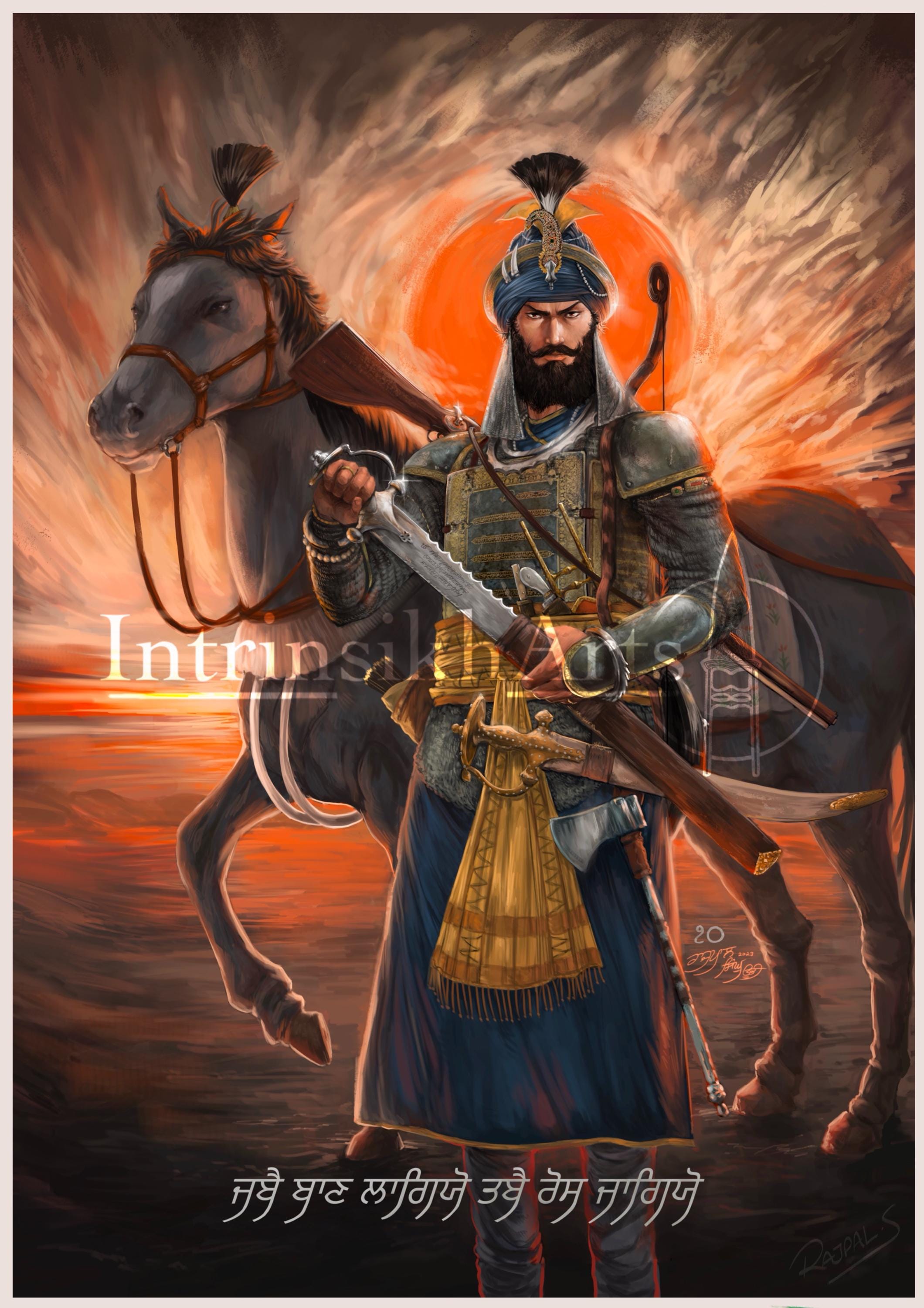 The basis of the art is to display the birRass (A warrior spirit) That Guru Gobind Singh embodied in his writings within the Dasam Granth's Bachittar Natak. The Guru writes ਜਬੈ ਬਾਣ ਲਾਗਿਯੋ ॥ ਤਬੈ ਰੋਸ ਜਾਗਿਯੋ ॥ , referring to the 'Rass' that enflamed within him as he was nearly wounded by an arrow. The chestplate in question (aka. The Charaina) has been depicted here, as with the artifact, with a hole on the bottom right side.