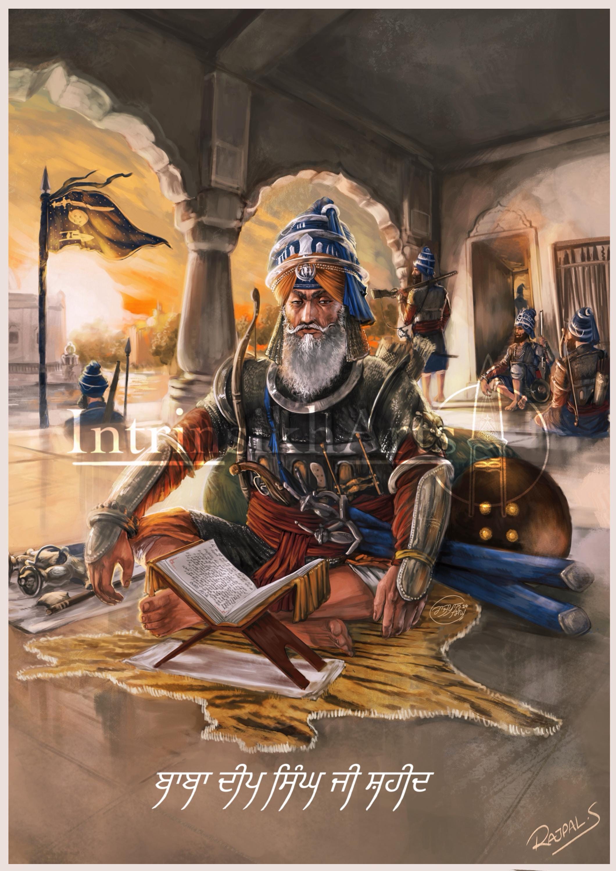 An artwork of Shaheed Baba Deep Singh ji, made with a focus on historical accuracy: The clothing, armaments, and weapons are all referenced from true artifacts.
