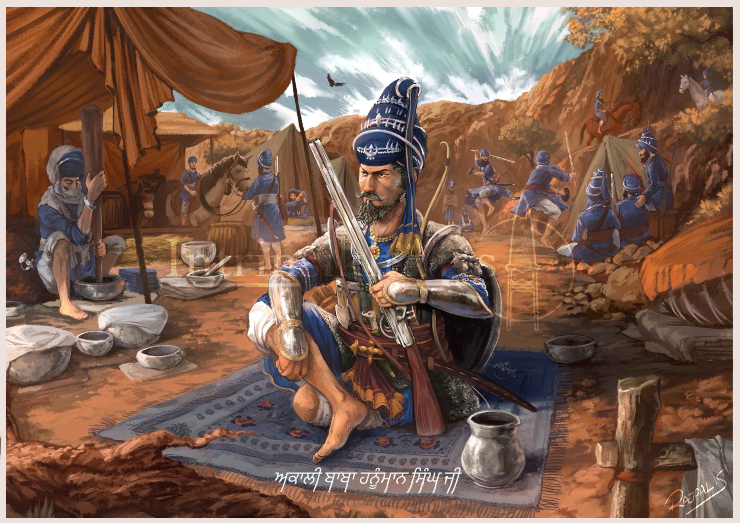An artwork of Akali Baba Hanuman Singh Shaheed, made with a focus on historical accuracy: The clothing, armaments, and weapons are all referenced from true artifacts.
